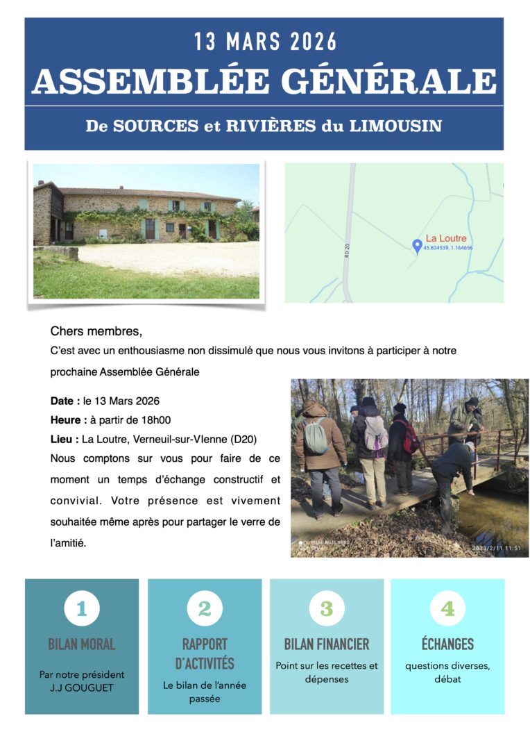 Assemblée Générale 2026 15 février 2026/dans Actualités /par SRL-cmLe conseil d’Administration de SRL invite tous ses adhérents à assister à l’ assemblée générale 2026. Nous vous attendons très nombreux Pour rejoindre le domaine de La loutre : cliquez Ici https://sources-rivieres.org/media/2021/09/riviere.jpg 1200 1600 SRL-cm https://sources-rivieres.org/media/2021/09/logo-web-srl.png SRL-cm2026-02-15 18:43:252026-02-15 20:43:40Assemblée Générale 2026